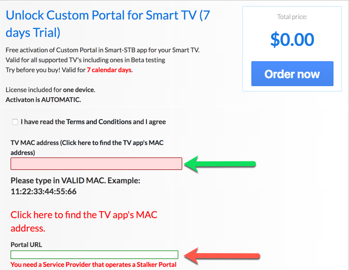 Opening the link provided above should show you the earlier picture. The green arrow shows the proper field for entering Software MAC Address. The red arrow shows the field in which we can enter the stalker portal URL of your IPTV provider. It can both be entered from here or later from the app on your TV. Remember to check the Terms of service box before finishing up. In the end, click on Order Now.